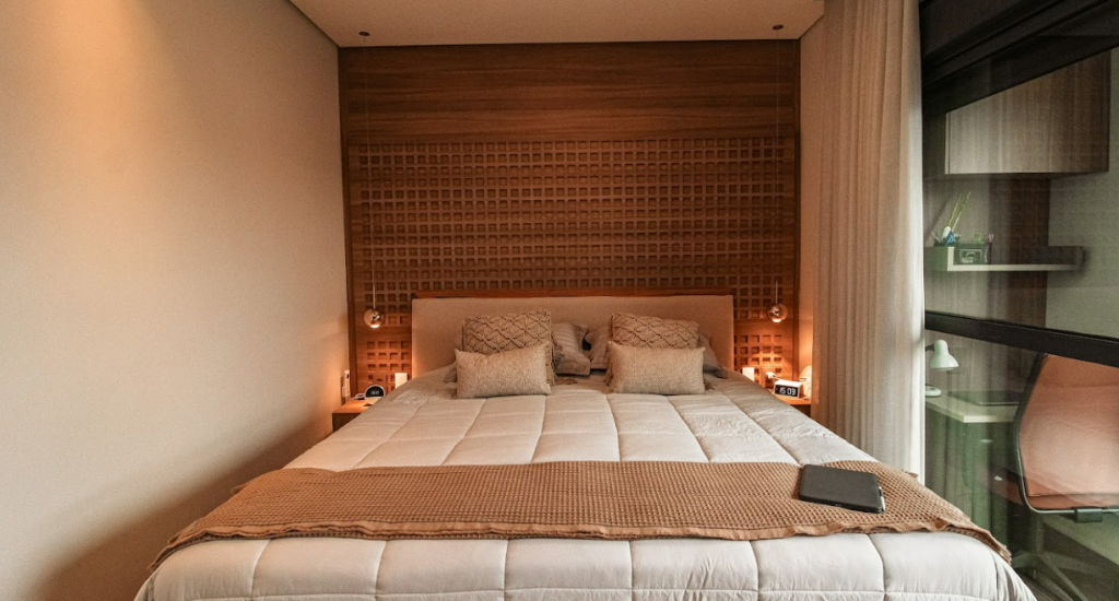 O dormitório possui detalhes em materiais naturais e a iluminação possui papel fundamental no aconchego do espaço