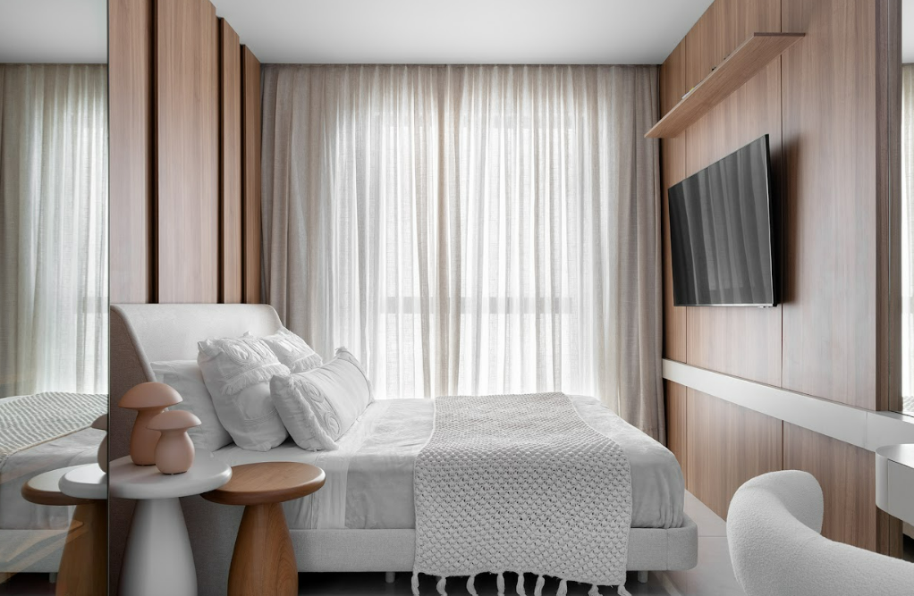 O dormitório possui elementos com identidade, sensibilidade e alto rigor estético