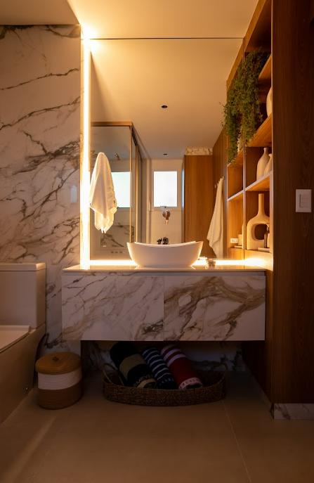 A escolha por luz quente, na temperatura de 2700K, reforça a sensação de acolhimento e bem-estar. Já a iluminação técnica foi posicionada de forma discreta, garantindo eficiência sem interferir na estética dos ambientes.