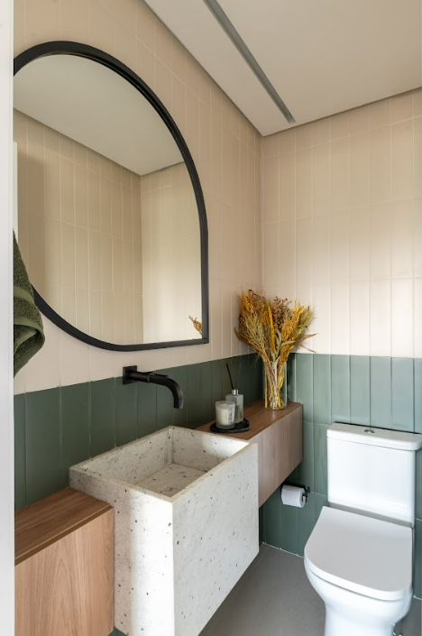 Na cozinha, o verde aparece como ponto de destaque nos móveis planejados, equilibrando frescor e aconchego. Já na suíte do casal, a paleta ganha tons mais sóbrios, com texturas que remetem ao cimento queimado, couro e detalhes em preto, criando um ambiente mais intimista e sofisticado.