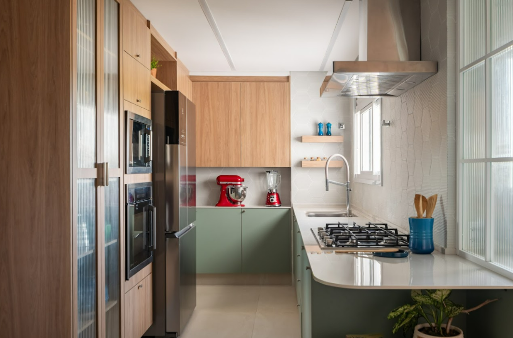 O verde aparece, na cozinha, como ponto de destaque dos móveis