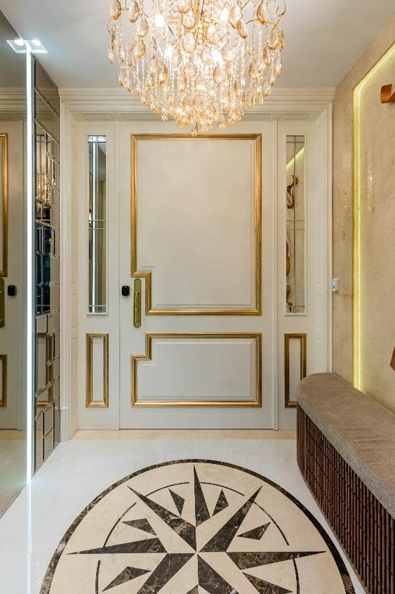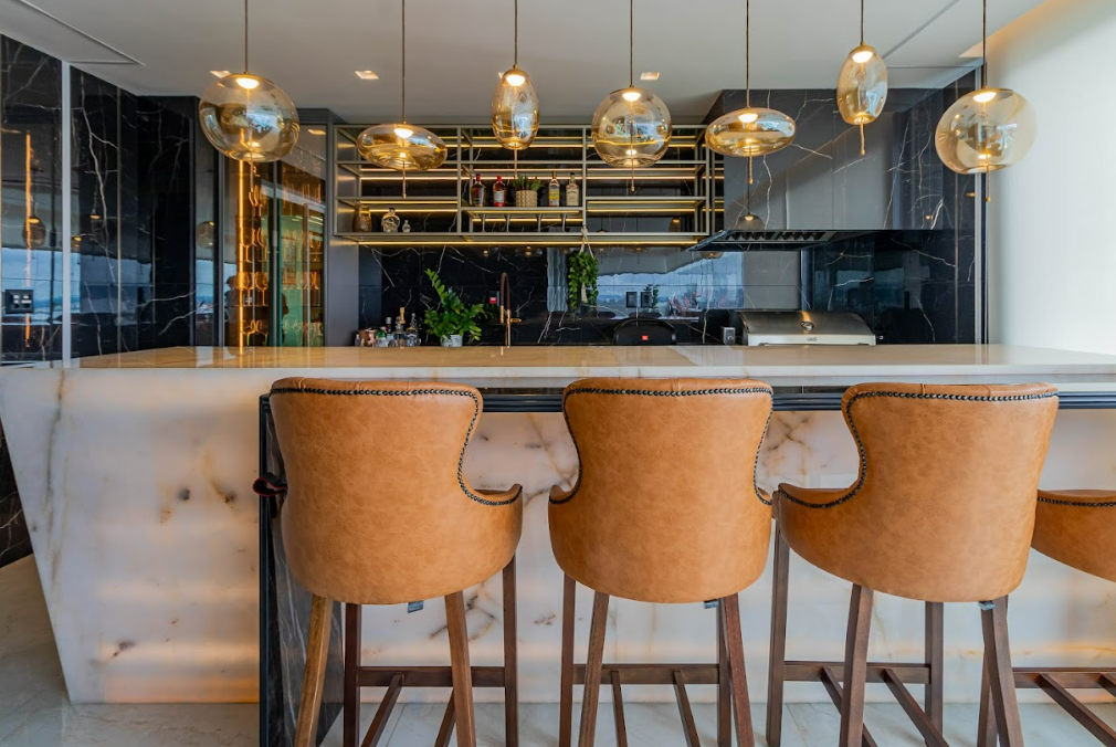 “A Rosa dos Ventos no piso do hall de entrada, feito pela Diqualitá, é um grande destaque. Outro ponto alto é o rodapé esculpido em mármore italiano em todo o apartamento, e também a bancada do gourmet em crystallo sunset, uma raridade”, comenta Josué.