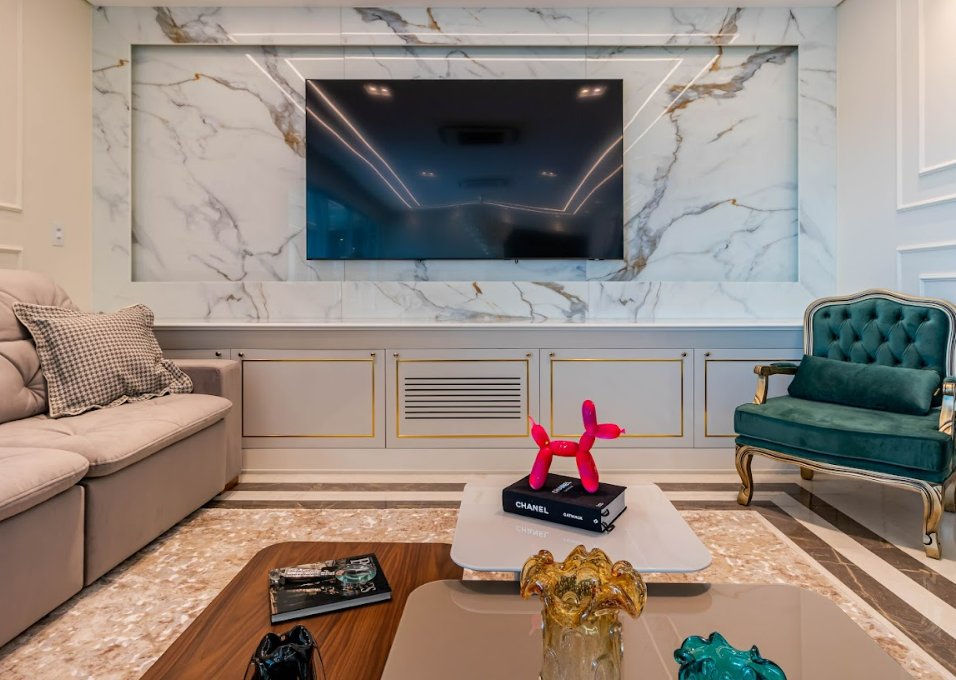 “No closet dos sonhos da moradora, a decoração segue um mood clean girl, bem delicado, com ar de princesa”, completa Josué. Em todo o apartamento, a iluminação é dimerizável, com lustres na sala e no hall em cristal genuíno. A circulação foi toda marcada com balizadores na parede e há iluminação indireta dentro de nichos na cozinha, além de recursos especiais para festa, com luzes de cores vermelho e roxo, que mudam com um controlador central, como se os moradores tivessem uma festa completa em casa.