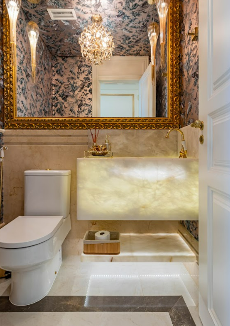 No lavabo, a banca iluminada garante a sofisticação, combinada à linha clássica Belle Epoque, da Deca, e ao papel de parede comprado pela cliente em São Paulo
