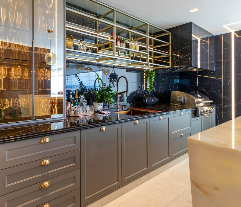 “Para o gourmet, os moradores queriam uma vibe mais astral. Então, usamos pedra onix retroiluminada, revestimentos de parede mais intensos e marcantes, como o nero marquina (Portobello), que fica lindo à noite, além de ser muito funcional”, explica o arquiteto. Na cozinha, a marcenaria leva um tom de cinza, que carrega uma memória afetiva para a moradora.