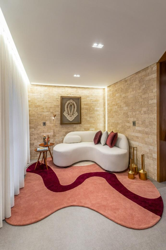 No décor, o mobiliário de linhas orgânicas e atemporais conversa com peças de design e objetos de personalidade. O tapete assume papel central ao trazer cor e movimento, conectando-se com os elementos decorativos e adicionando dinamismo à paleta. Detalhes em dourado e obras de arte completam a composição, criando um espaço moderno, acolhedor e cheio de identidade.