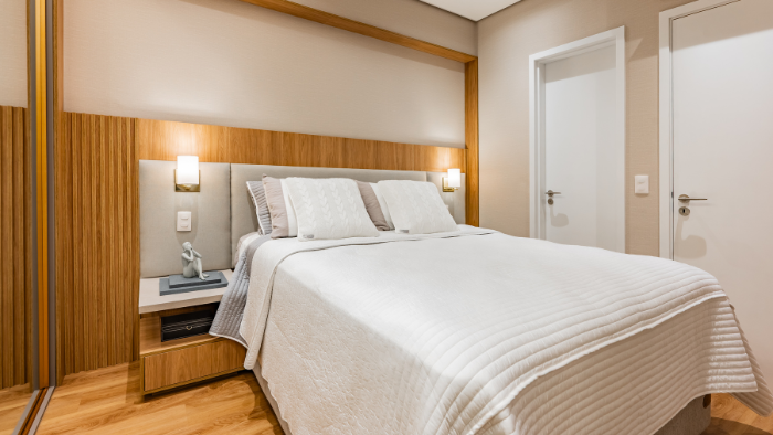 Entre os pedidos, estava a criação de um apartamento com atmosfera sofisticada, sem abrir mão da funcionalidade. Um dos destaques era o quarto do casal, que precisava remeter à sensação de um quarto de hotel, acolhedor e bem resolvido para os momentos de descanso.