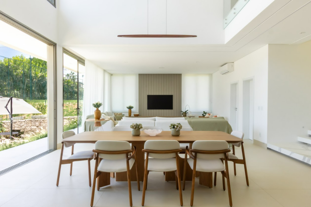 A combinação de perfis de LED, spots, pendentes e iluminação indireta garante diferentes cenários e usos ao longo do dia. No entanto, o grande diferencial da casa está na abundante iluminação natural, que valoriza os ambientes e reforça a conexão com o exterior.