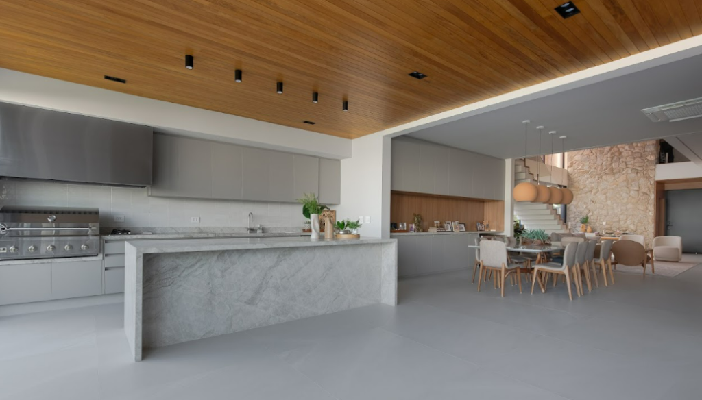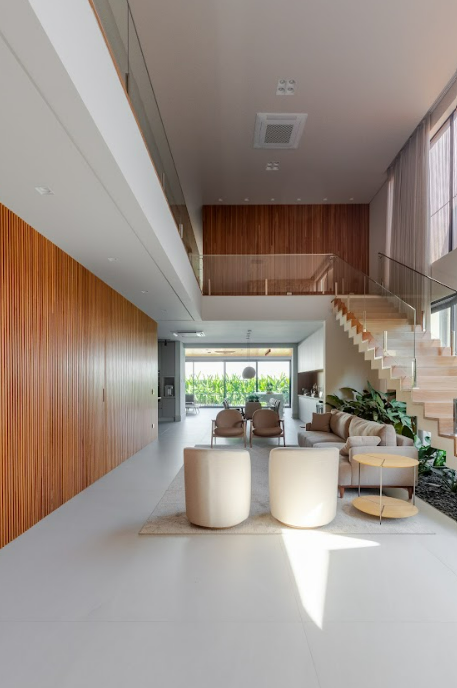 O paisagismo, assinado por profissional local, desempenha papel fundamental nessa proposta, atuando como extensão da arquitetura e contribuindo para conforto térmico, privacidade e estética.