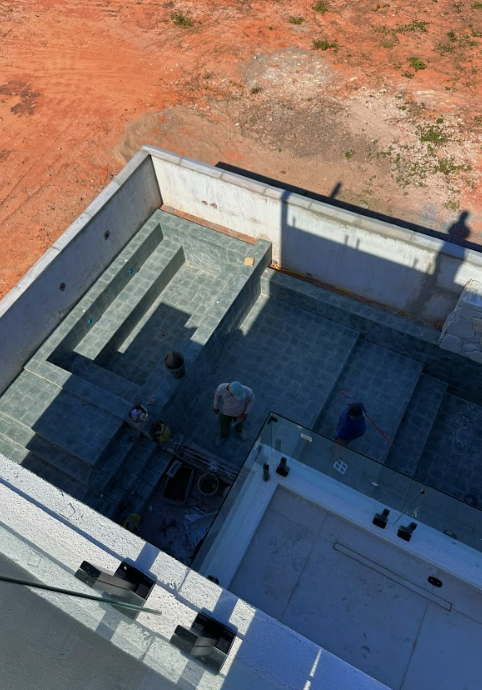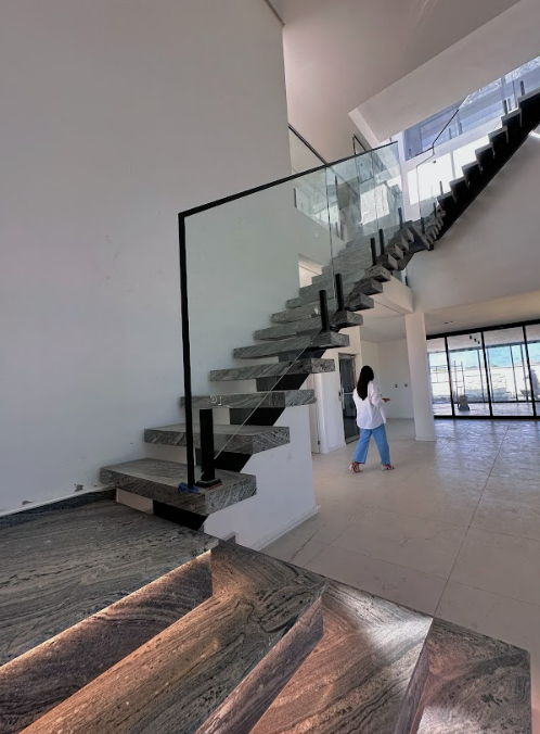 A residência conta com quatro suítes no pavimento superior e mais uma suíte no térreo, garantindo funcionalidade para diferentes perfis de usuários. Um dos destaques do projeto é a presença de um elevador, que atende todos os pavimentos e assegura acessibilidade e livre circulação. Além da área gourmet térrea, o projeto inclui um rooftop com vista para a lagoa, pensado como espaço exclusivo de contemplação e lazer para a família.