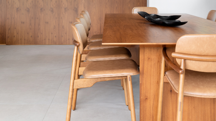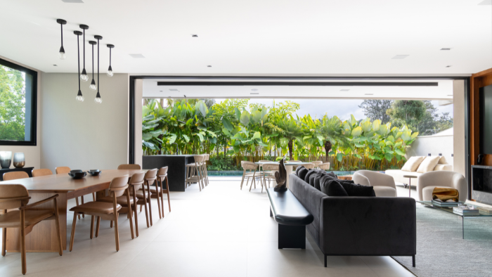 Para responder a esse estilo de vida, Ferreira criou um layout fluido, com integração visual entre os espaços sociais e vista para o jardim, além do uso de um revestimento único no térreo e portas-painel de madeira que permitem maior flexibilidade no uso da cozinha.