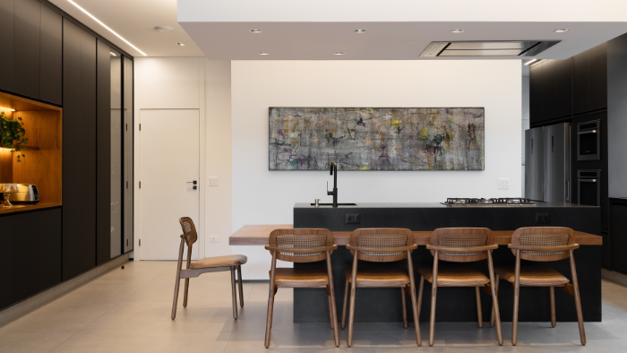 base contemporânea que valoriza o uso diário e as obras de arte da família