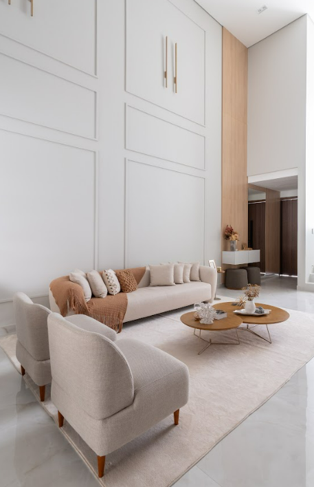 O sofá orgânico e a boiserie na parede de pé-direito duplo são alguns dos destaques do projeto