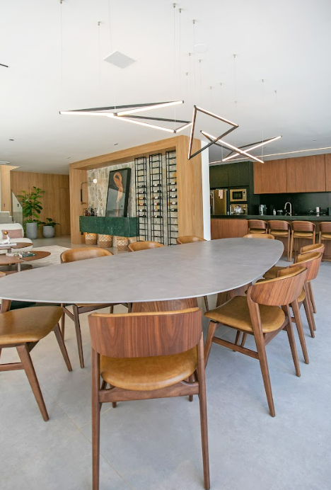 A residência, adquirida já construída, passou por uma reforma de interiores completa. O imóvel, entregue com acabamentos básicos, ganhou identidade através de soluções criativas e personalizadas. Entre os destaques, um telão retrátil transforma o living em um verdadeiro espaço de eventos, enquanto a fluidez entre os ambientes cria uma atmosfera convidativa e sofisticada.