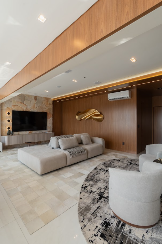 Entre os destaques está o painel em pedra natural com iluminação embutida, que valoriza a área da TV e estabelece um ponto focal elegante no living. A marcenaria curva contribui para a fluidez dos espaços, enquanto a bancada da cozinha com desenho orgânico, integrada à mesa de refeições, funciona como elemento central de convivência um convite ao encontro com leveza e elegância.
