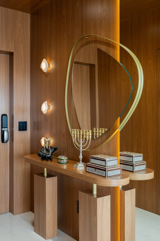 O conjunto de espelhos aplicados no hall amplia e dinamiza a percepção espacial logo na entrada