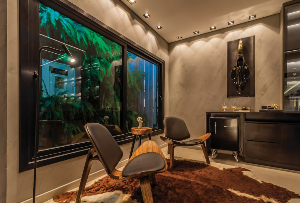 A iluminação desempenha papel central no projeto, reforçando o conceito sofisticado e valorizando os pontos estratégicos do espaço.