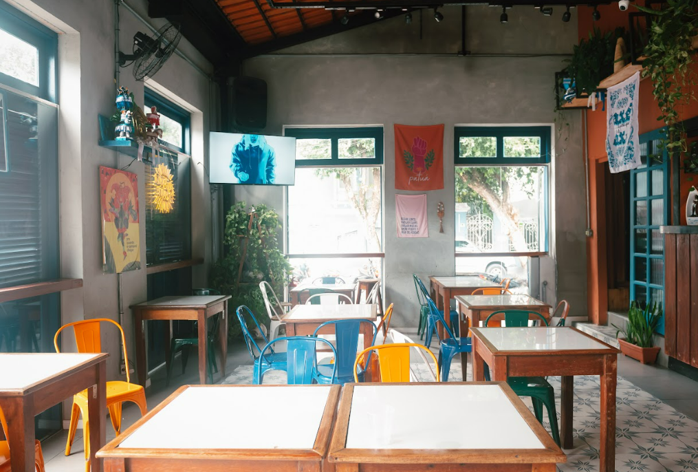 Assim, o projeto trabalhou com uma base de tons terrosos, que conversam diretamente com a parede descascada original da edificação, preservando sua autenticidade e valorizando sua história. Essa paleta neutra e acolhedora permitiu uma dose de ousadia nos elementos decorativos, como quadros, objetos e especialmente nas cadeiras, onde cores vivas e alegres trouxeram vida e movimento ao ambiente. O resultado é um espaço equilibrado, cheio de identidade, onde o passado e a cultura popular dialogam com a contemporaneidade de forma leve e autêntica.