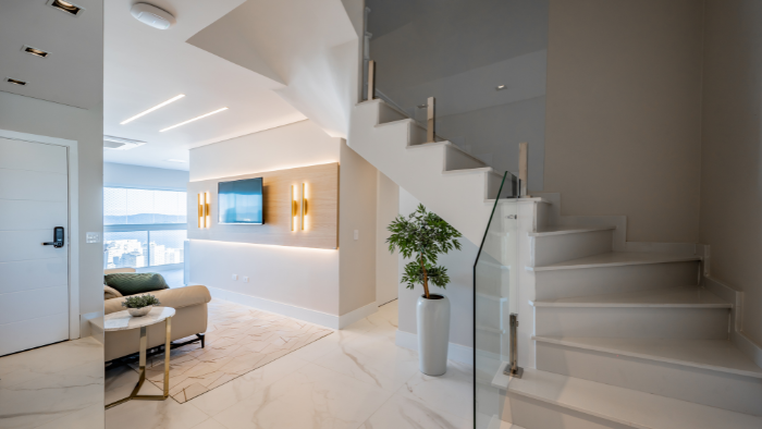 materiais, cores e iluminação para criar uma atmosfera sofisticada e acolhedora