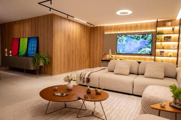 O projeto traz elementos modernos e elegantes, com móveis de linhas minimalistas, iluminação em perfil de LED preto e revestimentos neutros. O painel em madeira freijó aquece o ambiente e traz aconchego, enquanto o piso em porcelanato com acabamento de cimento queimado garante praticidade e um toque contemporâneo.