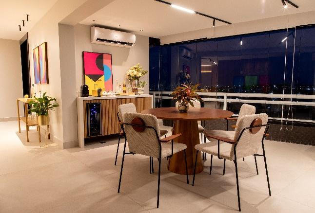 No apartamento, os encontros familiares são parte essencial da rotina. Por isso, o foco foi ampliar a área social da casa, integrando a sala com a varanda para criar um ambiente fluido, com mais espaço de circulação e convidativo. O destaque ficou para a criação da “mesa dos netos”, um cantinho especial onde os pequenos podem brincar, estudar ou fazer refeições próximos da família.