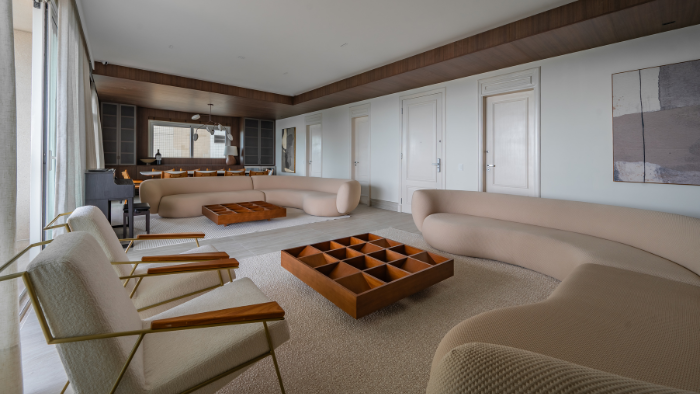 O ponto de partida foi criar ambientes amplos, acolhedores e preparados para receber amigos e familiares. A integração dos espaços sociais foi essencial para que o apartamento funcionasse como um lugar de convivência, sem abrir mão do conforto e do uso prático.