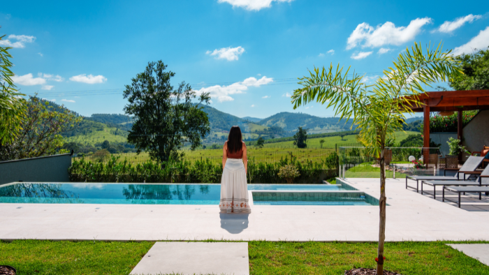 e integração com a natureza ao redor da casa, destacando a arquitetura contemporânea