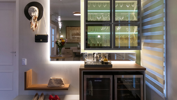Os detalhes foram pensados para valorizar o conjunto, como o uso de espelho com iluminação indireta ao redor e a luz interna posicionada atrás das prateleiras de vidro da cristaleira, criando um efeito visual marcante e agradável.