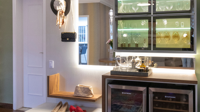 A principal solicitação era criar um ambiente que reunisse bar e apoio de chegada, acomodando adega, frigobar, coleção de taças, além de um local organizado para casacos, chapéus e calçados, tudo com uma linguagem contemporânea.