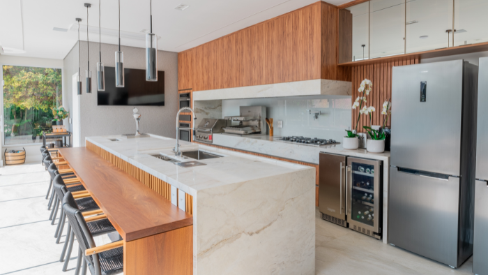 O espaço gourmet recebeu atenção especial, com equipamentos e eletrodomésticos de ponta, integrando-se à área da piscina e ao jardim, criando um ambiente perfeito para receber amigos e familiares com conforto e funcionalidade.