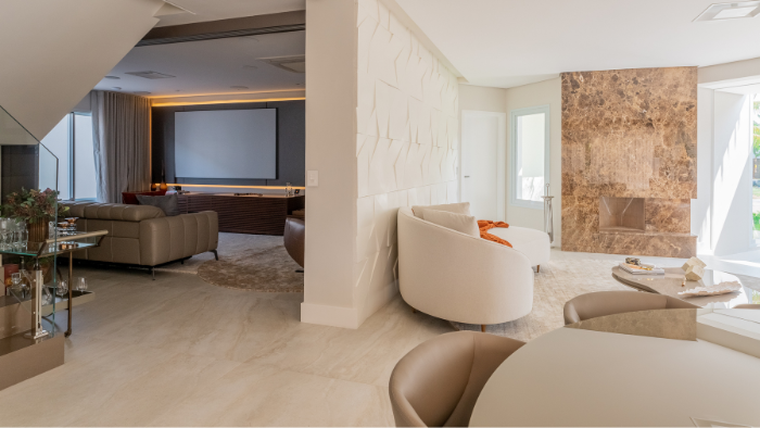 O home theater foi projetado com sistema completo de automação, som e vídeo, garantindo tecnologia de ponta aliada à estética, enquanto o pavimento superior passou por remodelações nas suítes e varandas, mantendo a circulação fluida e os espaços delimitados.