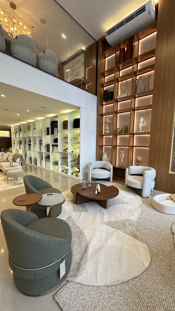 A principal solução foi a criação de novos núcleos dentro do espaço, como a nova D’Casa Home, loja-conceito voltada para a curadoria de objetos de decoração. Além disso, Nathalia criou o Cadeiródromo, espaço de destaque para cadeiras assinadas e peças de design icônicas, e renovou a Boutique, agora com piso vinílico, o que trouxe um novo ritmo visual ao layout e acolhimento sensorial ao percurso do cliente.