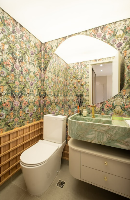 O lavabo com papel de parede estampado, muxarabi em madeira e bancada em tom verde surpreendem os clientes