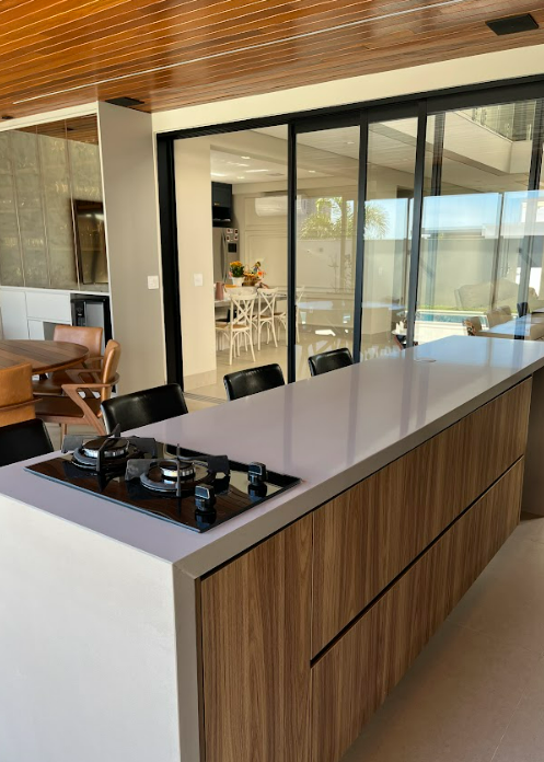 O perfil dos clientes, um casal entre 35 e 40 anos, com filhos pequenos e rotina dinâmica, direcionou o conceito do projeto. A família valorizava momentos de convivência e também a recepção de amigos, buscando uma casa que equilibrasse a integração e privacidade.