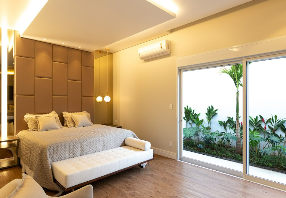 Na área da piscina, uma parede de samambaias cria a sensação de “selva urbana”, trazendo frescor ao ambiente. Já na área íntima, os ambientes se abrem para um jardim lateral que funciona como um quadro vivo, emoldurado pelas esquadrias de vidro, ampliando visualmente os espaços e reforçando a sensação de refúgio.