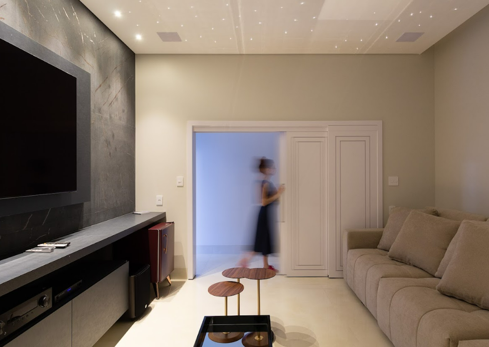 Apesar da integração, a residência também contempla momentos de recolhimento. Além da sala de TV integrada à área social, foi projetada uma sala de TV íntima, com 19,03 m², concebida como um refúgio da família. O ambiente conta com sistema de som integrado e iluminação especial, oferecendo conforto e privacidade para momentos de descanso.