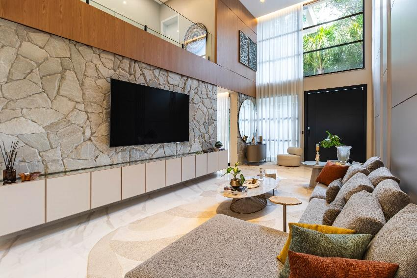 A pedra moledo na parede da TV é ponto central na sala de pé-direito duplo