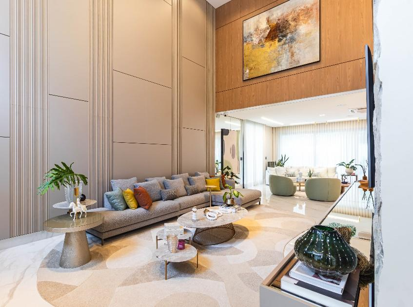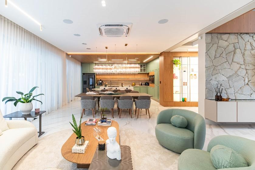 O mobiliário de alto padrão da Artefacto foi escolhido para compor os espaços com elegância e funcionalidade, evidenciando o cuidado com cada detalhe. No home, o painel com pedra moledo em pé-direito duplo se torna protagonista, imprimindo força, textura e identidade ao espaço.