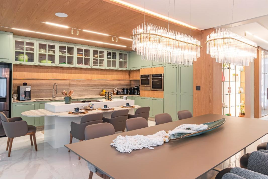 O projeto, concebido para um casal de empresários com um filho, que adora receber amigos e familiares, apresenta como um dos grandes destaques a cozinha clássica, da Todeschini, em que o tom verde foi cuidadosamente selecionado para trazer requinte e sofisticação.