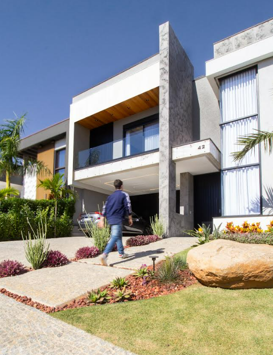 A fachada expressa o conceito do projeto: volumes marcantes, linhas contemporâneas e integração com o paisagismo