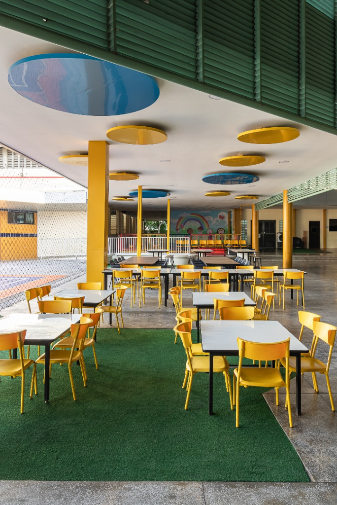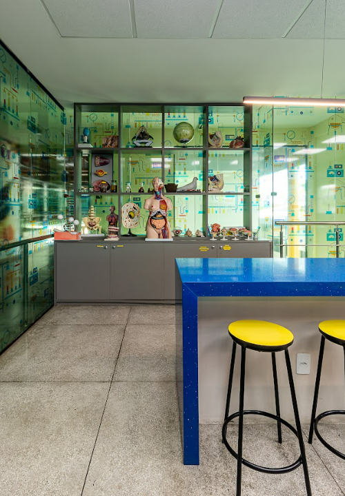 Internamente, os ambientes administrativos e laboratório científico ganharam uma nova roupagem. “Também aproveitamos o espaço de uma antiga piscina para ampliar o pátio interno e a área coberta, utilizando um design de iluminação moderno, mas que ao mesmo tempo mantém o tom lúdico buscado pelo cliente”, explica Sophia.