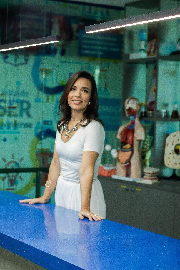 A arquiteta Sophia Pereira posa no laboratório científico do colégio, que integrou o projeto de retrofit