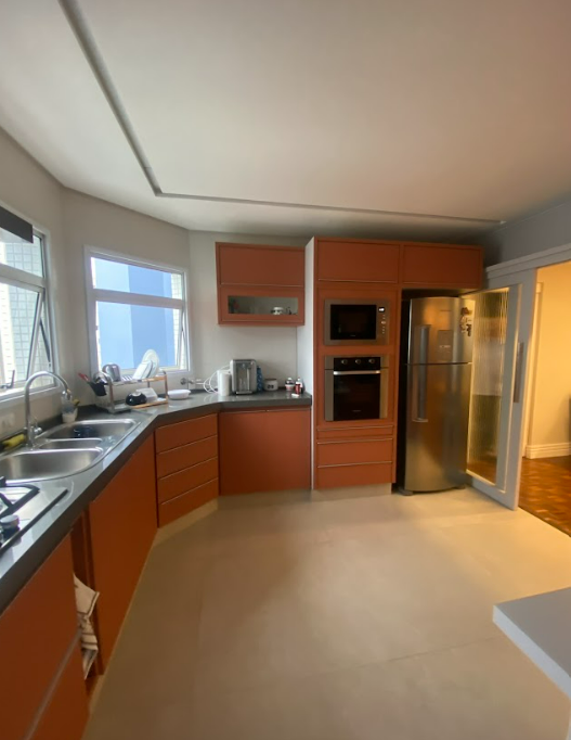 A reorganização do layout foi fundamental para melhorar a circulação e o uso dos espaços. O piso de tacos existente foi preservado, valorizado tanto por sua nobreza quanto pelo vínculo afetivo e pela qualidade do material. Na cozinha, a retirada da ilha original ampliou a fluidez do ambiente, enquanto os armários foram mantidos, renovados e complementados, atendendo de forma mais eficiente às necessidades de armazenamento e uso diário.