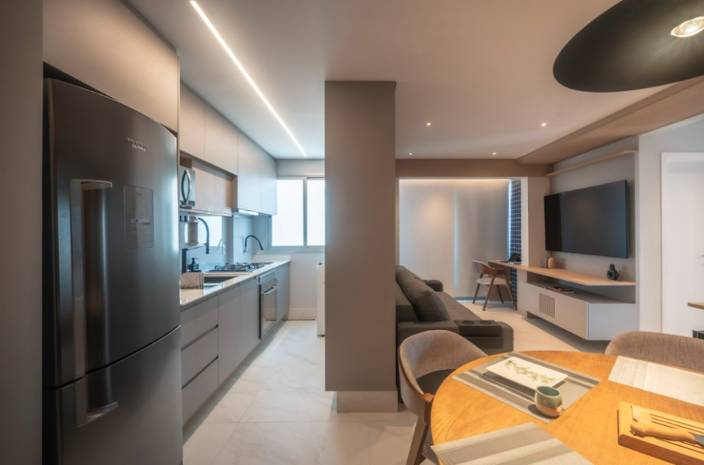 A integração da sala e cozinha foi uma solução estratégica para ampliar os ambientes
