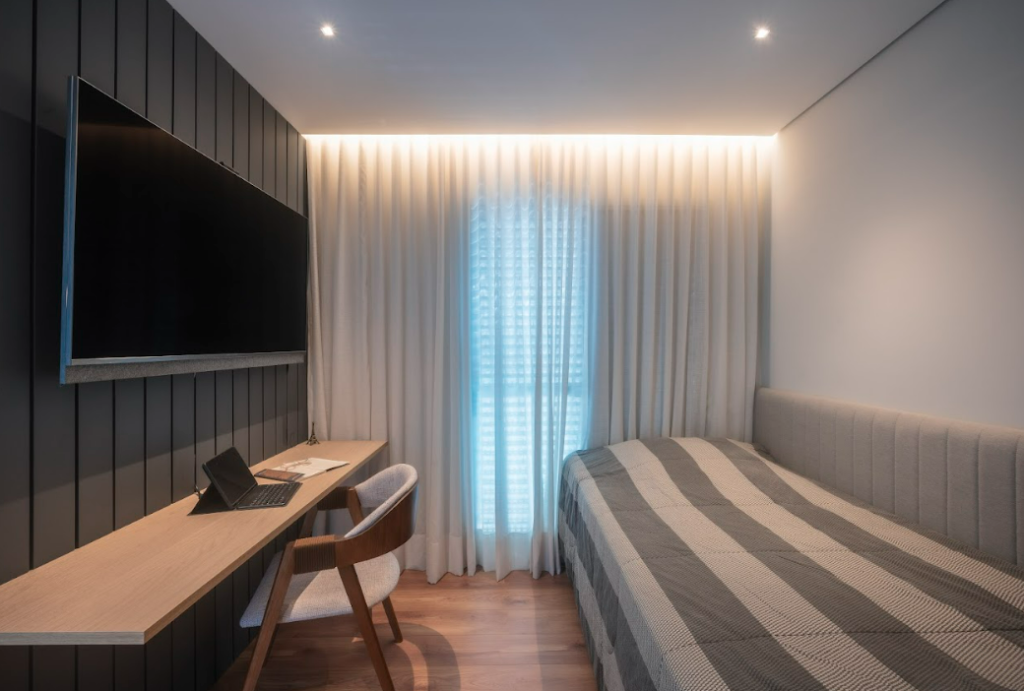 A iluminação foi pensada como elemento fundamental de conforto e ambientação. O projeto combina luz direta, indireta e difusa, utilizando luminárias minimalistas e soluções técnicas precisas. Perfis lineares de LED na cozinha, luminárias na sala, quartos e banheiro, sancas iluminadas na entrada e nos cortineiros, iluminação na cabeceira e um único pendente sobre a mesa de jantar criam uma atmosfera equilibrada e acolhedora. A escolha da temperatura de cor 3500K reforça a sensação de aconchego, sem comprometer a funcionalidade.
