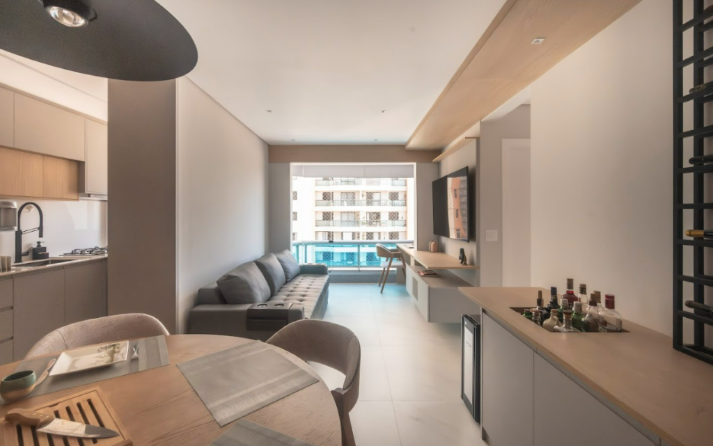 Com 70m², o apartamento, anteriormente sem reformas, passou por uma transformação completa para atender ao estilo de vida de um morador solteiro, empresário, com cerca de 58 anos, que valoriza funcionalidade, conforto e momentos de convívio, especialmente para cozinhar, degustar vinhos e receber amigos.