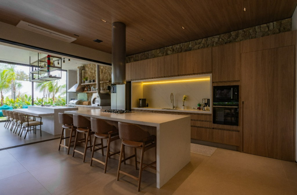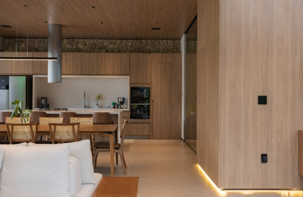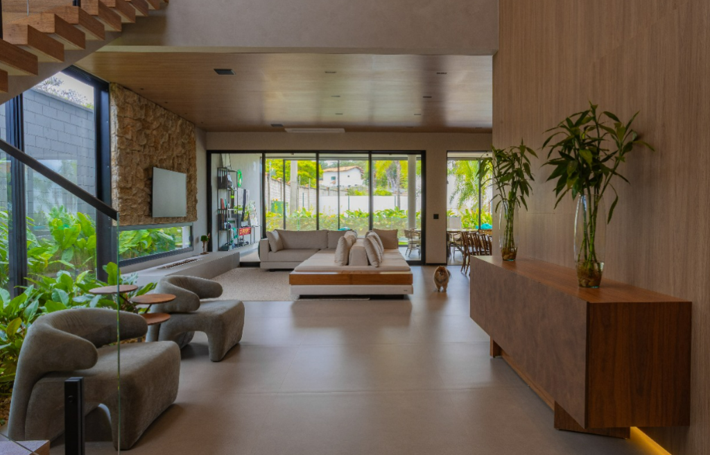 Para atender a essas demandas, a arquitetura aposta em ambientes amplos, integrados e visualmente abertos, com forte presença de materiais naturais, como madeira, pedra e vegetação. Esses elementos conferem leveza aos espaços, reforçam a sensação de aconchego e criam uma conexão direta com a natureza, característica marcante do projeto.