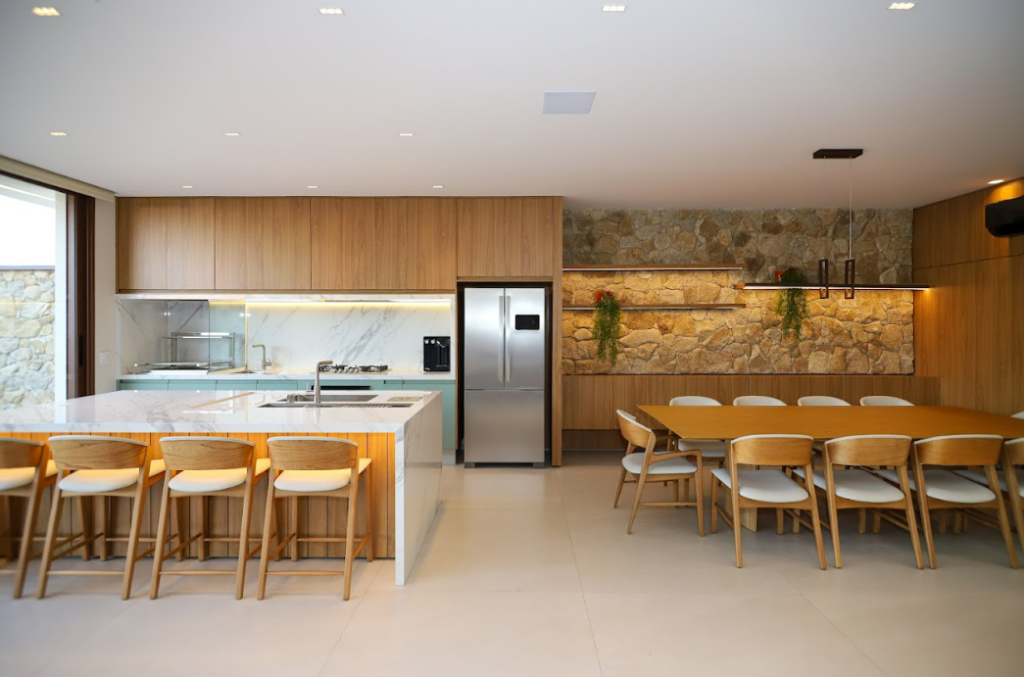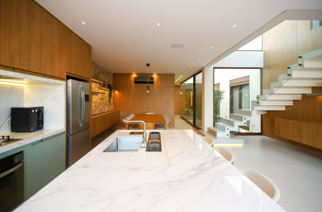 A arquitetura valoriza a fluidez espacial e o equilíbrio entre cheios e vazios. Grandes planos de vidro permitem a entrada de luz e reforçam a integração visual, enquanto a composição de materiais naturais, como pedra e madeira, adiciona textura, calor e atemporalidade ao projeto.