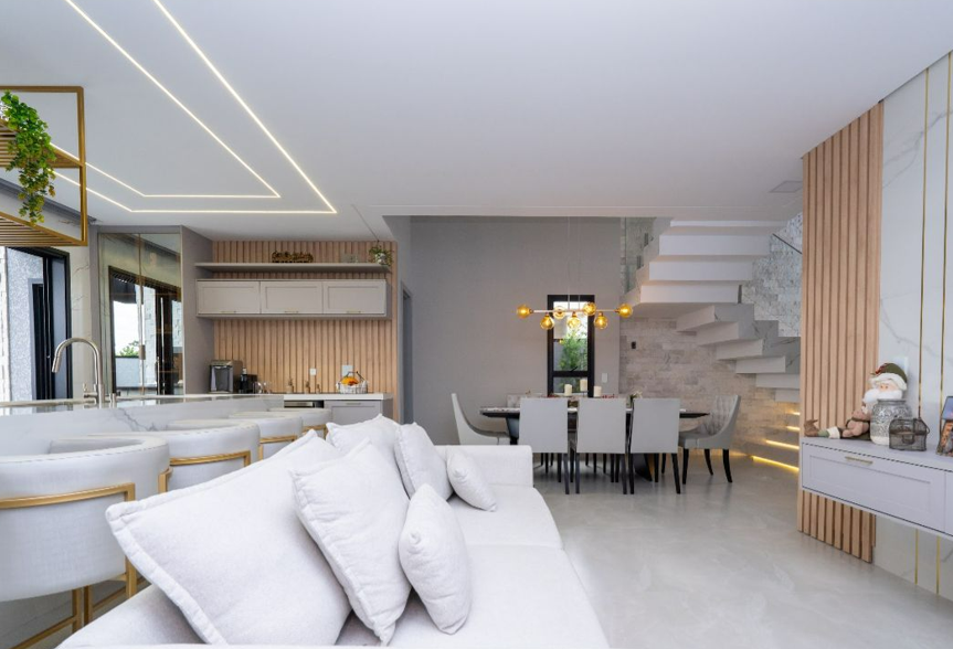 Com 250m² de área total, o projeto teve como foco principal os espaços sociais — cozinha, sala de estar e jantar — que juntos somam 125m² e representam o coração da casa. Pensados para acolher, integrar e valorizar o convívio familiar, esses ambientes foram desenhados para acompanhar a rotina de um casal jovem com um filho pequeno, equilibrando estética, funcionalidade e conforto.