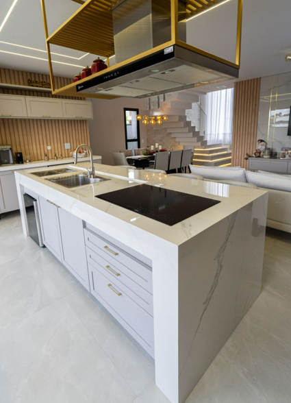 O projeto teve como foco principal os espaços sociais: cozinha, sala de estar e jantar, pensados para valorizar o convívio familiar